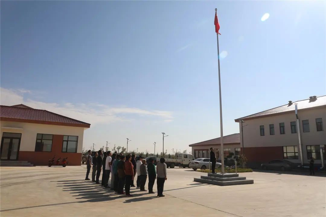 伴随着嘹亮的国歌声,五星红旗在金色晨光的沐浴下冉冉升起,在蔚蓝天空的映衬下,五星红旗更加鲜艳,高高飘扬在白音乌苏嘎查新村的上空。村民们行注目礼,共同祝愿祖国繁荣昌盛、人民幸福安康。