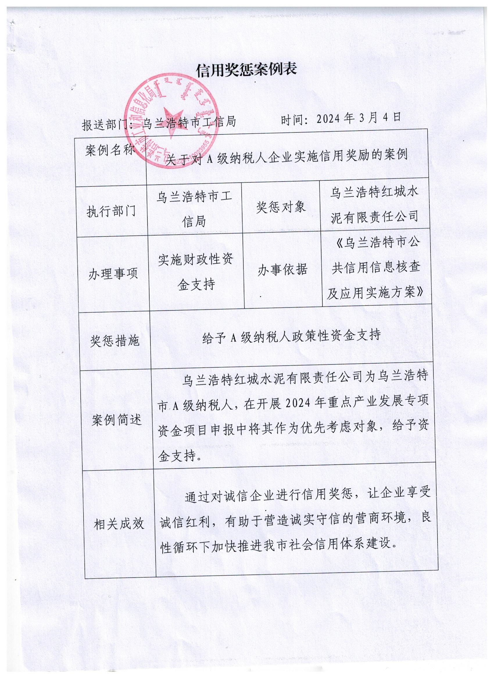 关于对A级纳税人企业实施信用奖励的案例