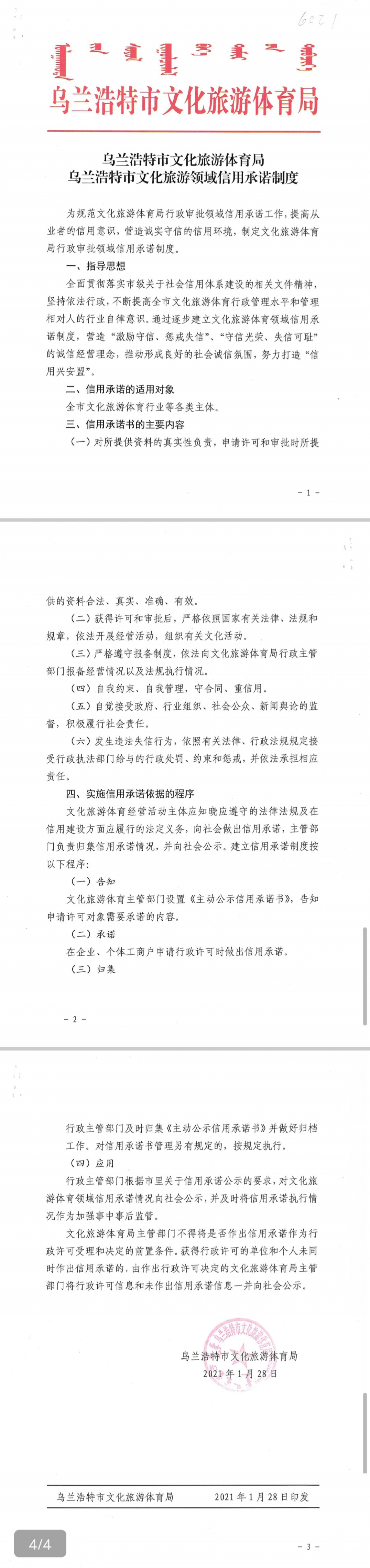 乌兰浩特市文化旅游领域信用承诺制度