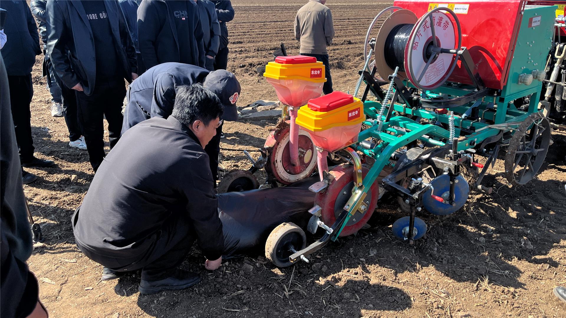 推广会现场,工作人员正在向村民讲解大垄双行密植浅埋滴灌技术的运作原理。覆膜播种机将一粒粒玉米种子按照预先设定好的间距,播撒进两条平行的种沟里,工作人员将黑色滴灌带埋入膜布下,在为农作物提供稳定供水的同时,也达到了节水的效果。