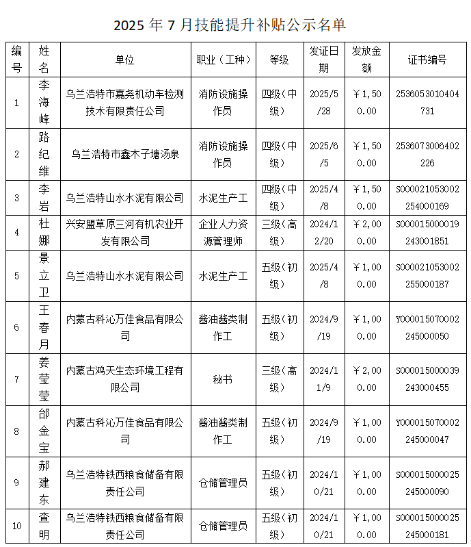 按照《内蒙古自治区人力资源和社会保障厅财政厅国家税务总局内蒙古自治区税务局关于延续实施失业保险稳岗惠民政策措施的通知》(内人社发〔2025〕18号)文件要求,现将2025年7月份享受职业技能提升补贴人员进行公示,公示时间为5个工作日。