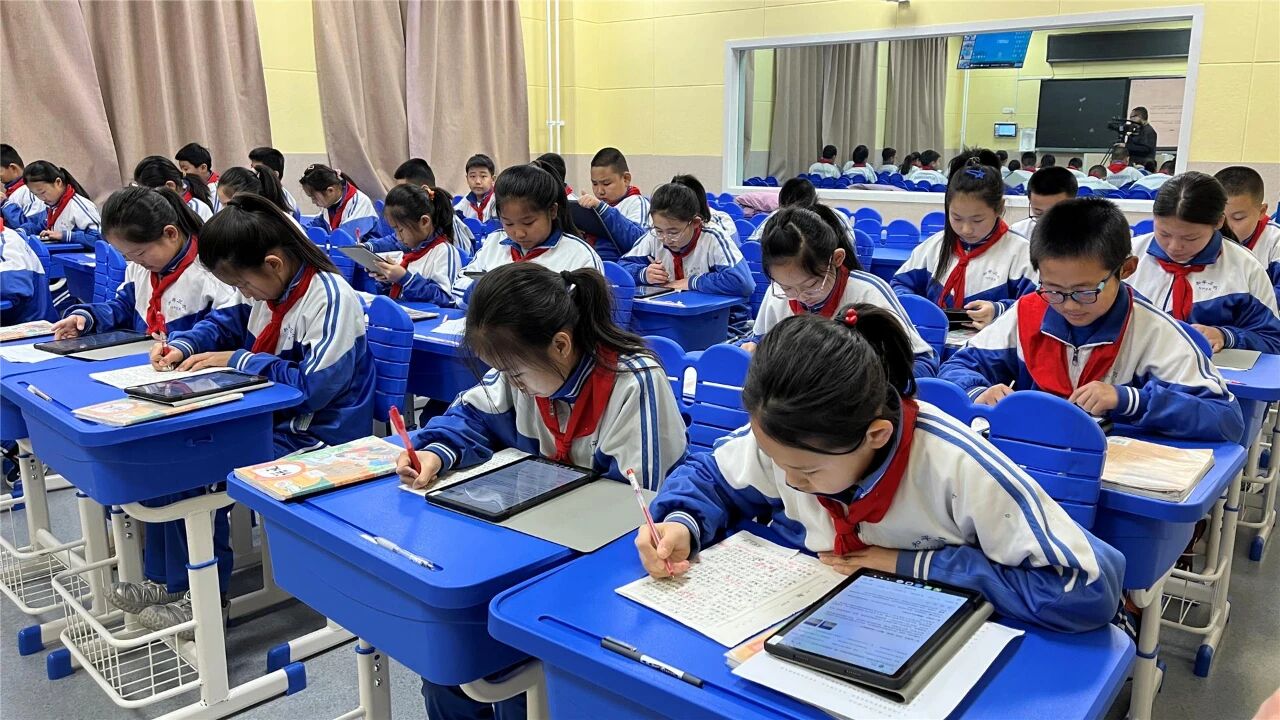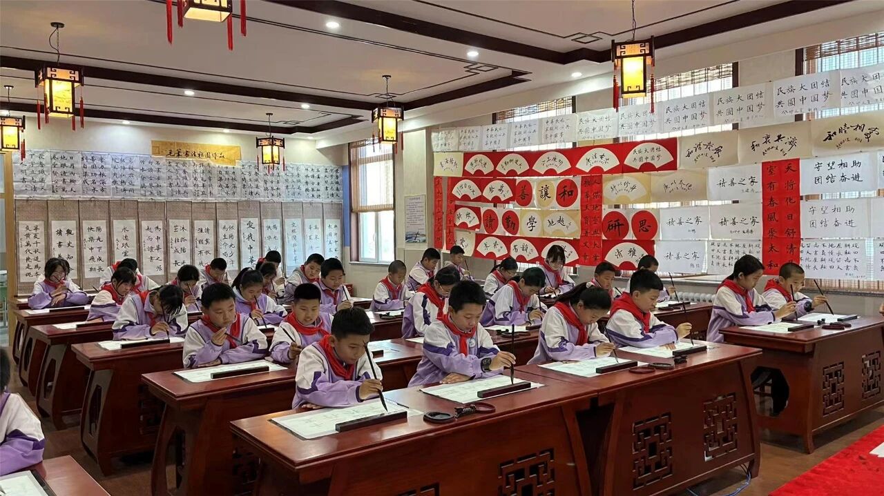 作为乌兰浩特市智慧教育试点学校,乌兰浩特市白鹭学校的智慧课堂建设极具代表性。在学校书法教室内,学生们正手握毛笔,跟着智能屏幕认真临摹,屏幕上可以清晰投射出起笔、行笔、收笔的完整轨迹,学生们手腕轻转、落笔沉稳,在传统与科技的交融中感受汉字的结构之美与书写韵味。