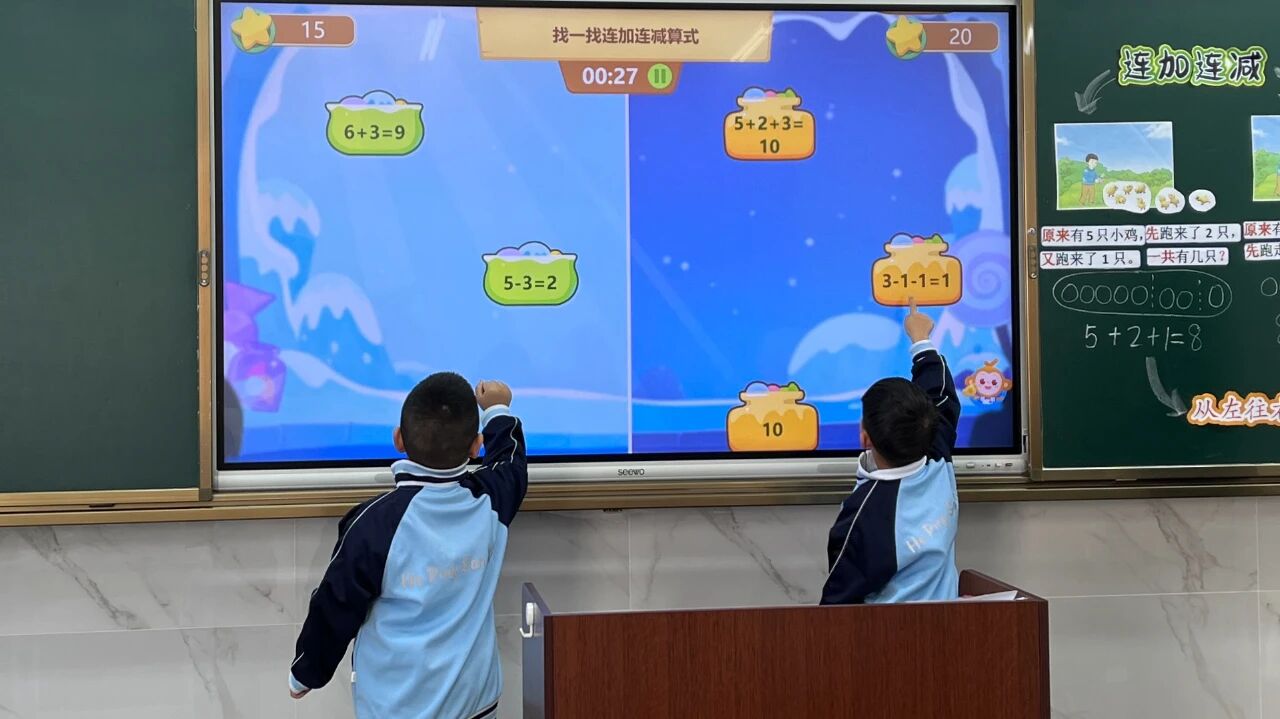 在乌兰浩特市和平第三小学,一场趣味十足的数学课正在进行。讲台上,教师通过电子白板开展直观授课,屏幕上实时生成动画,将抽象的数学公式转化为生动场景,搭配互动感十足的数字游戏,学生们积极主动举手参与答题,课堂氛围热烈。