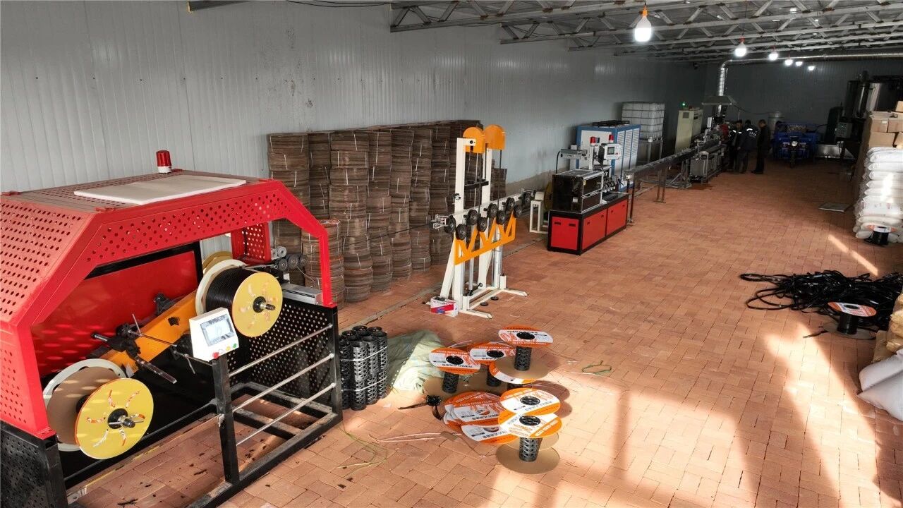 走进厂区,自动化生产设备高速运转,一卷卷成品滴灌带整齐码放,工人们正在有序进行巡检和打包作业。据了解,该项目于2025年3月启动建设,整体占地3000平方米,在盘活金星村党群服务中心西侧闲置空地的基础上,新建贴片式滴灌带加工生产线1条,目前已正式进入生产阶段。