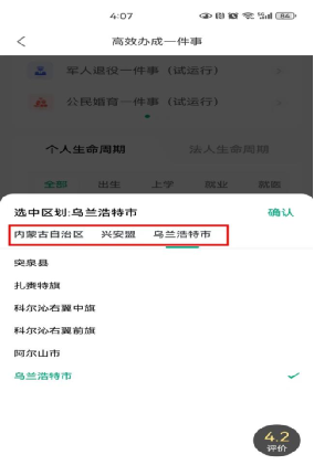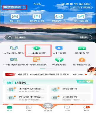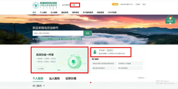 1. 首页点击“乌兰浩特”,选择“一件事专区”进入“高效办成一件事 ”模块。
