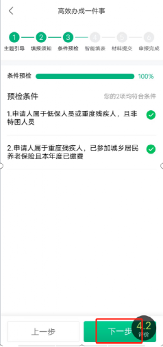 4. 按照主体引导,选择要办理的业务,按照提示点击“下一步”-“条件预检”符合后,点击“下一步”即可填表提交材料,等待审核。(注意:必须先取得残疾人证才可网办剩余事项。)