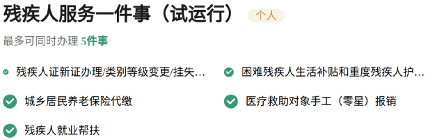 深入优化服务模式,将涉及残联、民政部门、人社部门、医保部门办理的11件“单事项”及办事环节集成为残疾人服务一件事,以业务协同、系统互联和数据共享的优化提升方式,“减环节、减时间、减材料、减跑动”实现“一件事一次办”,提升群众办事的便捷度、体验感和满意度。