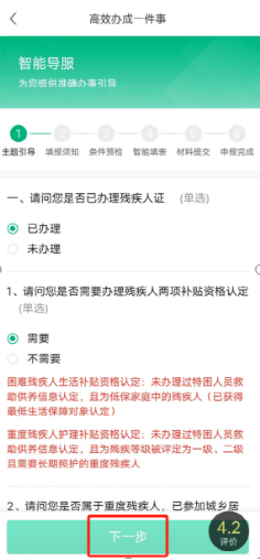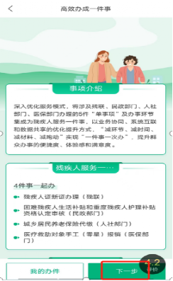 3. 选择地区-阅读“残疾人服务”一件事解读-点击“下一步”开始办理。