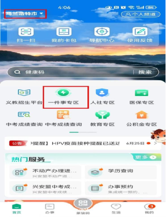 1. 首页点击“乌兰浩特市”,选择“一件事专区”进入“高效办成一件事 ”模块。