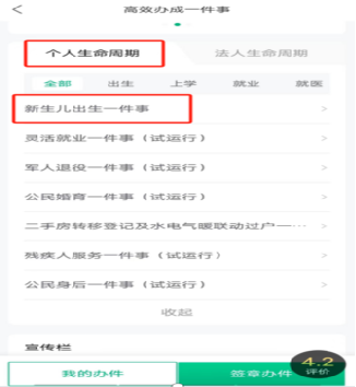 2. 从下面当中的“个人生命周期”选择办理“新生儿出生一件事”即可办理。