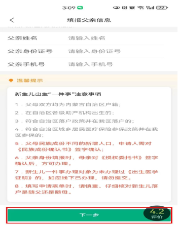 5. 填写母亲及父亲姓名等必填信息,点击“下一步”,按照提示信息填写。