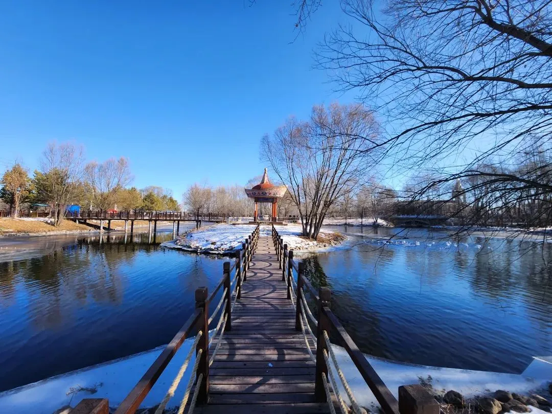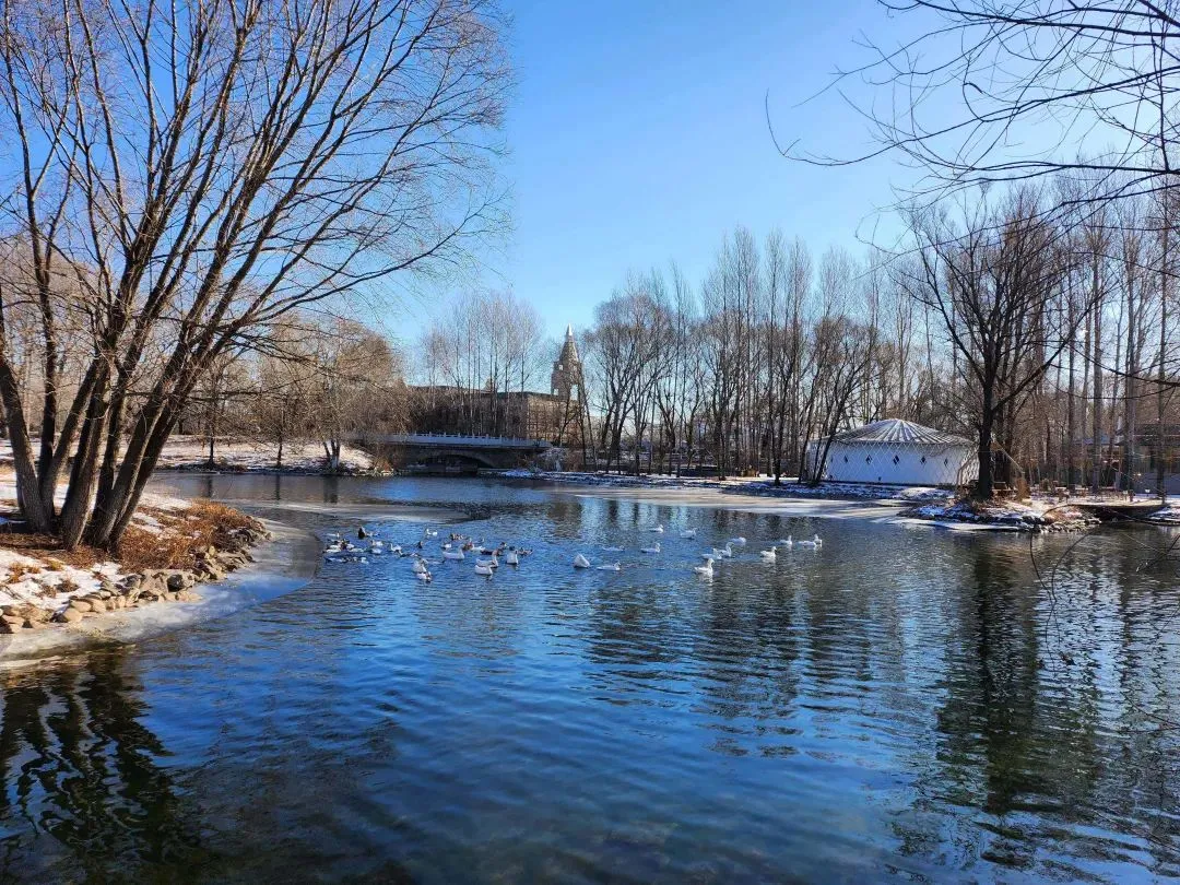 首站来到义勒力特,这里是冬季里的奇妙乐园。义勒力特水景公园河水水质清澈,冬季水温在3.5℃-4℃之间,严冬从不封冻,是水景公园别致的生态景观。这里流水潺潺,漫步在静谧的小径上,可以尽情享受自然的宁静与和谐。