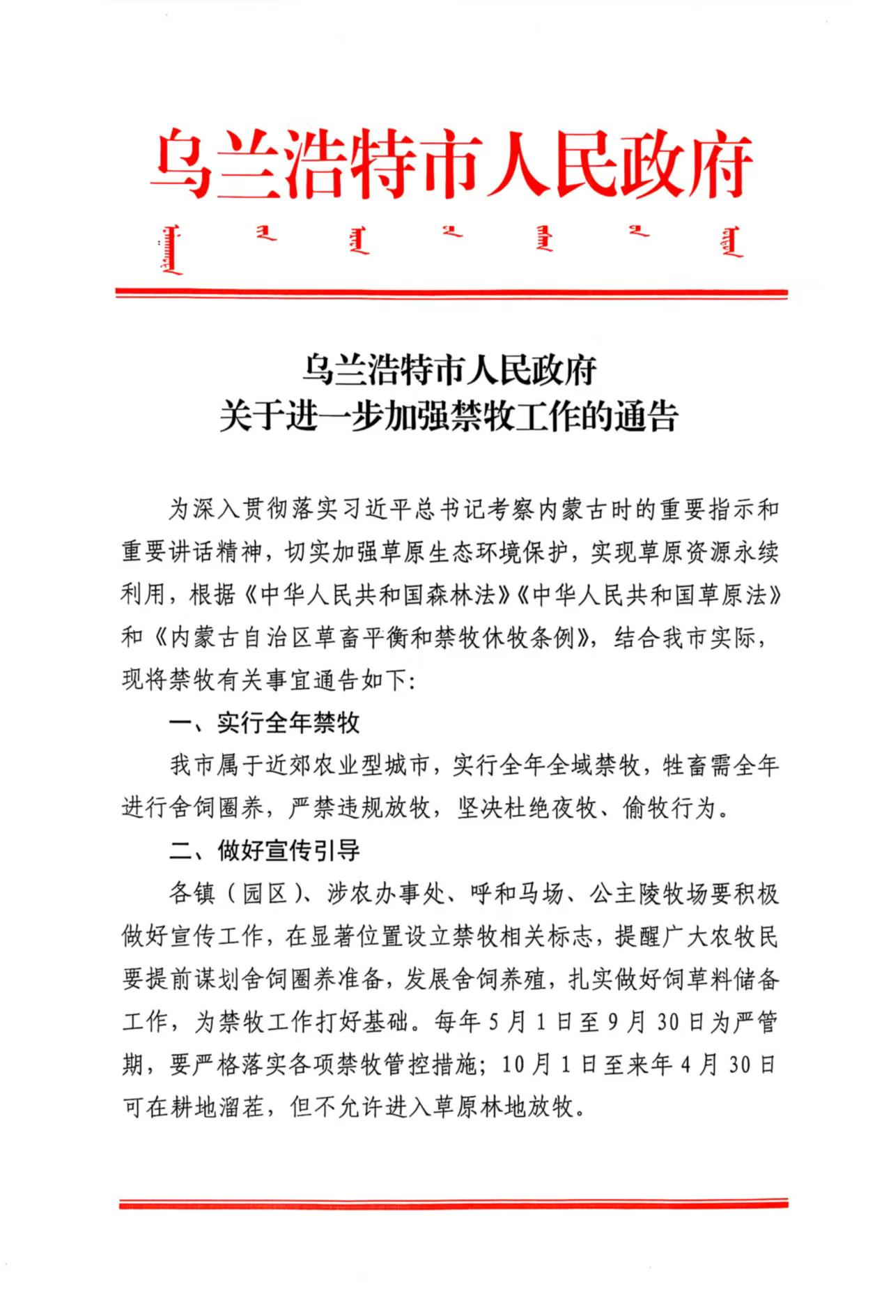 乌兰浩特市人民政府关于进一步加强禁牧工作的通告