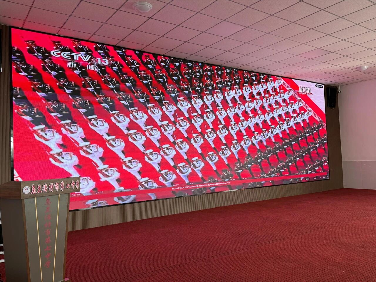 在乌兰浩特市第七中学大会议室,100余名学生身着整齐校服,与老师们坐在大屏幕前,目光紧紧锁定直播画面。伴随着雄壮的国歌声,天安门广场的五星红旗缓缓升起,全体师生起立饱含深情地高唱国歌。气势恢宏的阅兵仪式上,中国人民解放军飒爽的英姿和高精尖的武器装备,引得欢呼声和掌声响彻整个教室。