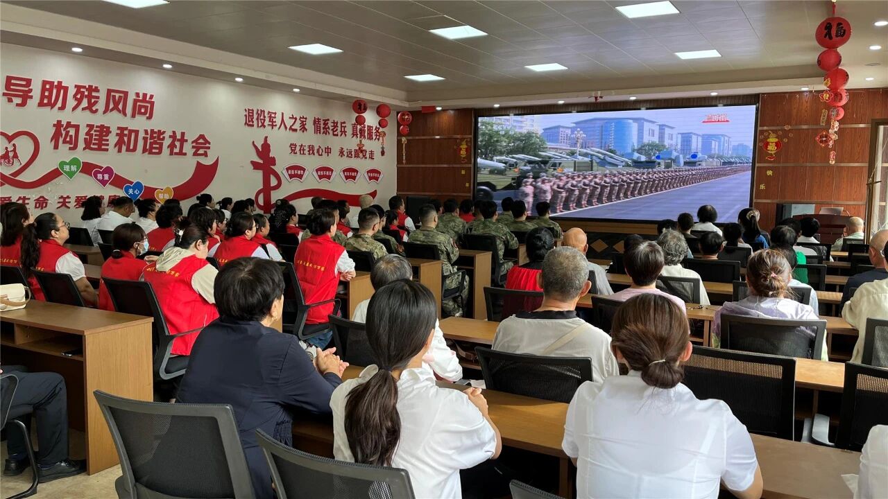 在乌兰浩特市胜利街办事处,志愿者、退役军人、机关干部等一同观看阅兵直播。随着激昂的军乐奏响,屏幕上受阅部队依次亮相,大家的目光都紧紧地锁定在屏幕上,眼神中满是专注与自豪。