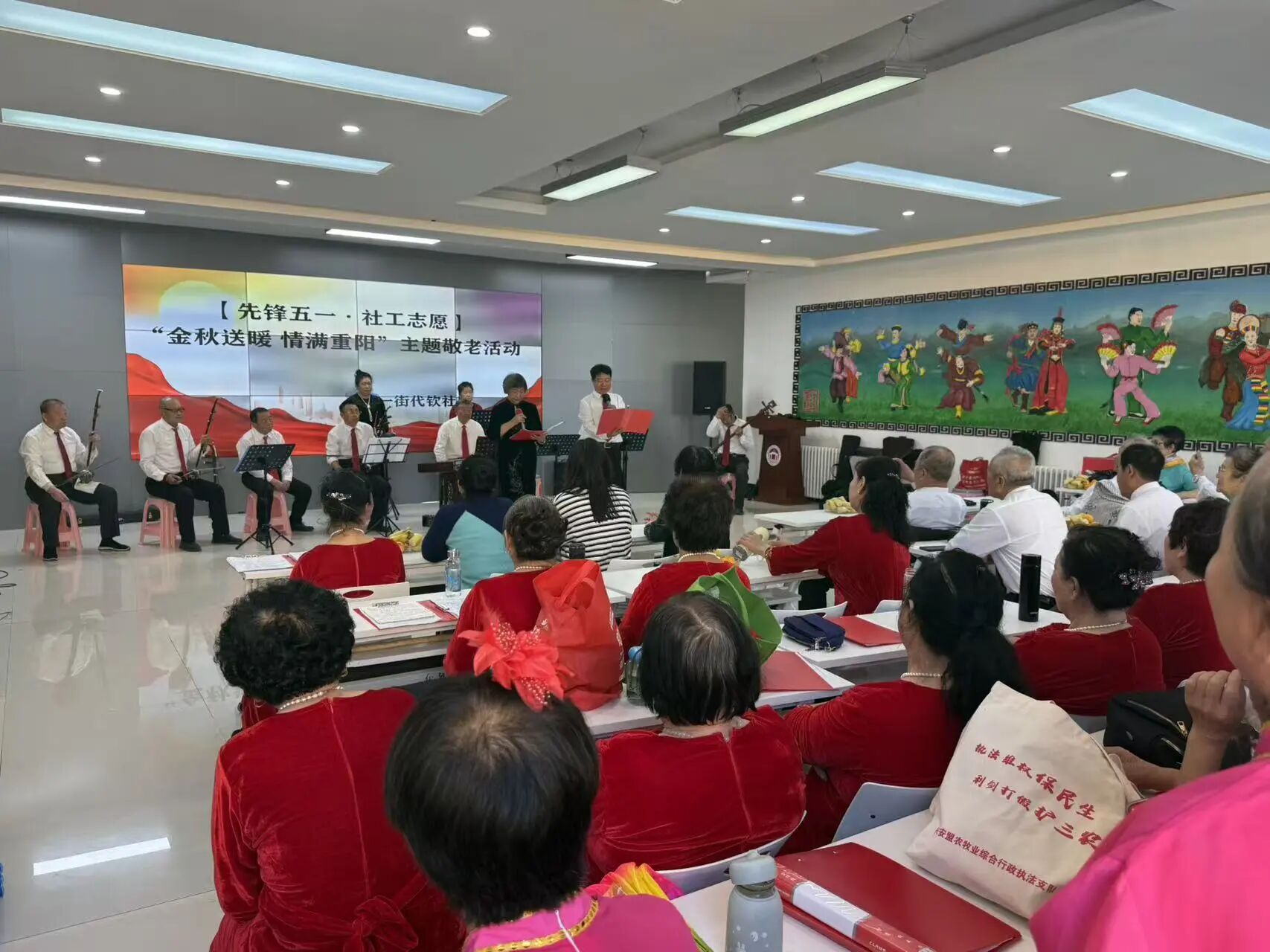 文艺表演环节更是将氛围拉满!志愿者与老年居民的《牧歌一曲献给党》,旋律激昂、情感真挚,唱出了对家国的赤诚热爱;舞蹈《红旗飘飘》舞步轻快、活力四射,尽显老人们精神矍铄的风貌;独唱演员将演出推向高潮,温暖的歌声回荡在活动现场,让老人们倍感温馨。台下掌声、喝彩声此起彼伏,现场俨然成为欢乐的海洋。汇演节目内容多样,丰富了老人们的精神文化生活,让他们在精彩演出中感受到节日的欢乐与温暖,进一步营造了敬老爱老的浓厚氛围。