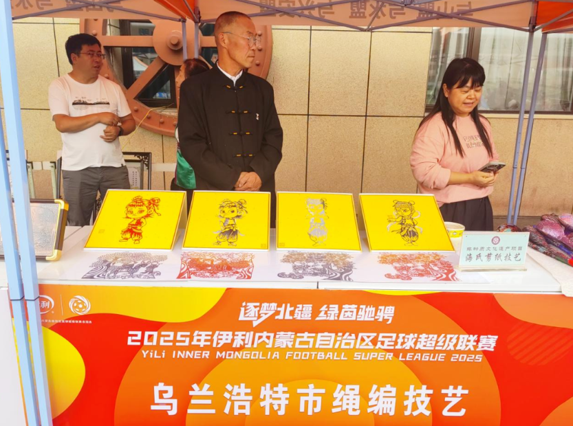活动筹备阶段,市文旅体局提前对接各级相关单位,结合不同活动主题与受众特点,精准筛选适配的非遗项目及传承人,确保非遗展示与活动定位高度契合。在多场文化旅游体育活动现场,非遗展示区均成为核心亮点:其中,在内蒙古足球超级联赛 2025 赛事现场,盟级剪纸技艺传承人海金宝带来以“哪吒”为主题的定制剪纸作品,极具视觉冲击力。作品中,哪吒手持火尖枪、脚踏风火轮的经典形象栩栩如生,线条流畅且富有神韵,既保留传统剪纸的细腻质感,又巧妙融入体育赛事“活力拼搏”精神内核,实现神话形象灵动性与足球运动激情的完美融合。现场观众纷纷驻足观赏、合影留念,年轻球员表示,此类非遗作品为赛事增添了文化温度,让传统艺术与体育精神产生奇妙共鸣。