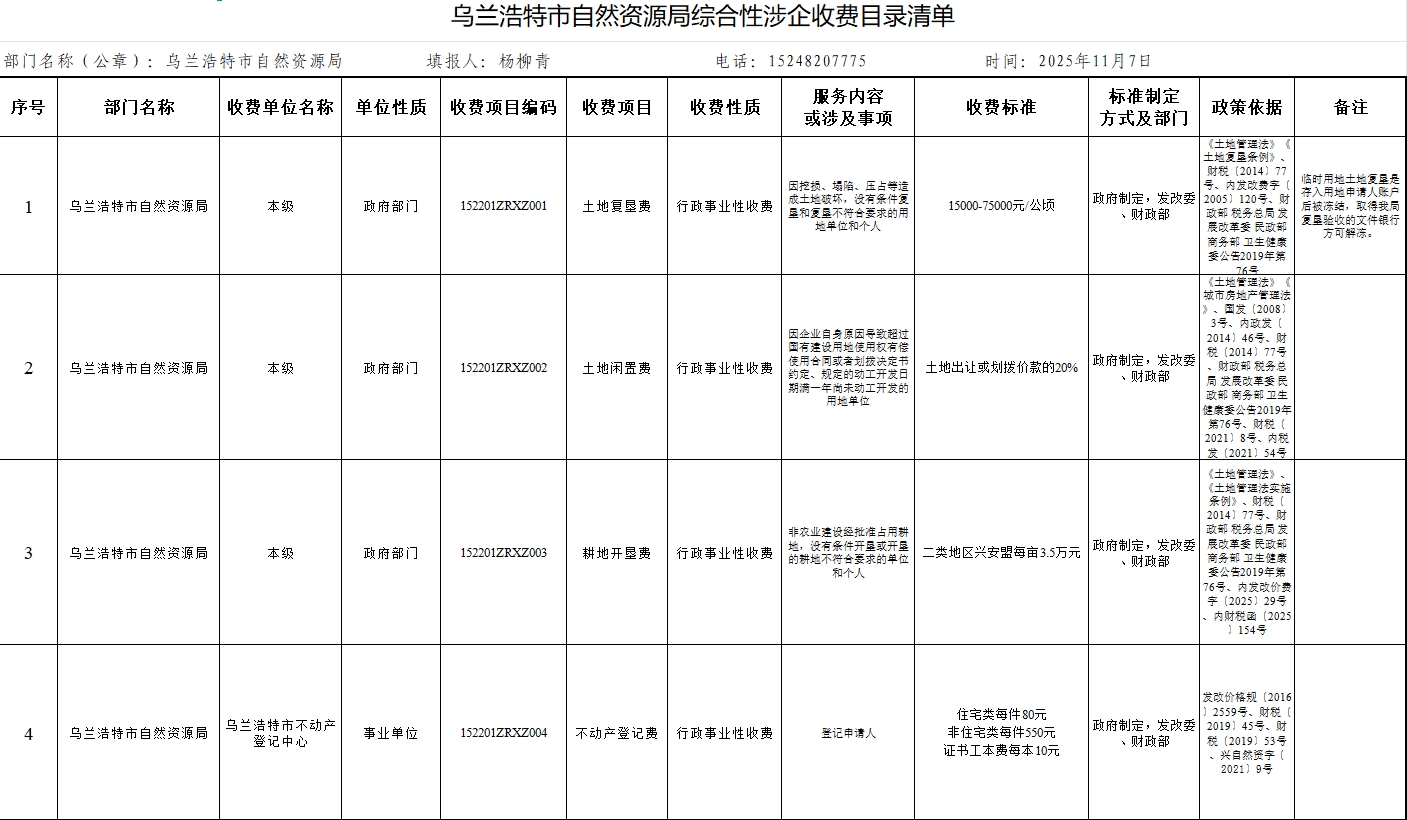 乌兰浩特市自然资源局综合性涉企收费目录清单