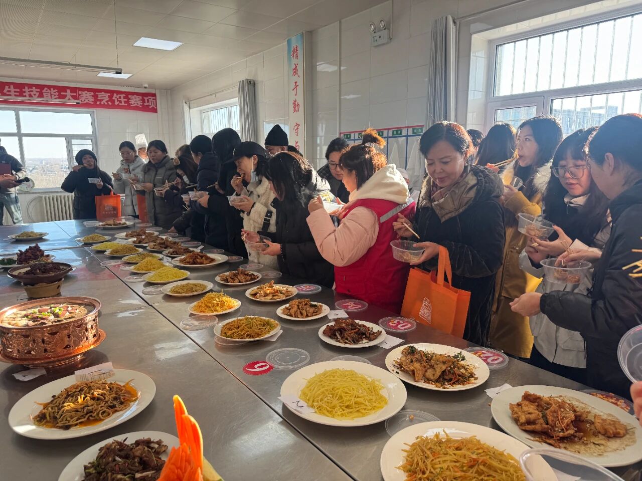 活动现场,厨艺交流区香气四溢,选手们分为企业厨师经验交流组、居民创意厨艺组、学生厨艺展示组三大组别,大家分工协作、有序配合,切配、烹饪、摆盘等环节一气呵成。企业厨师们纷纷亮出看家本领,一道道色香味俱全的招牌菜与创意菜接连出锅;居民和学生选手则围绕“土豆+猪肉”这一指定食材展开创意比拼,用巧思和手艺赋予家常菜全新风味。专业评委老师对每道菜品的口味、造型、创意进行逐一细致点评,企业代表也全程参与品鉴交流,在美食切磋中精准发掘技能人才,为后续招聘对接奠定基础,现场氛围热烈而融洽。