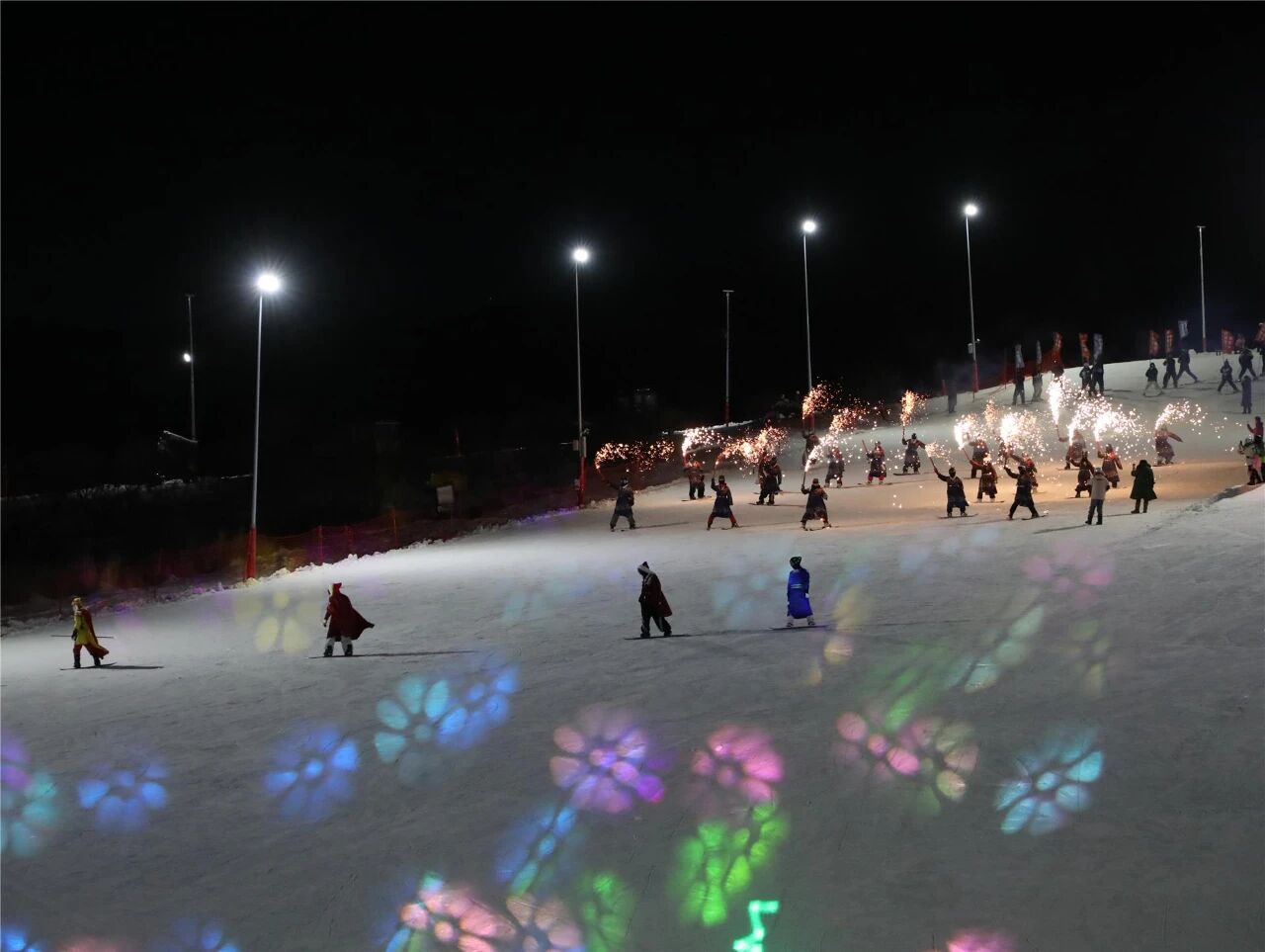 开幕式上,五彩斑斓的烟花在空中绽放,绚烂光影与洁白雪地相映成趣,激昂的音乐响彻全场,将现场氛围推向高潮。随后,国风主题滑雪表演精彩上演,表演团队身着特色服装手持“来内蒙古做客先到乌兰浩特”条幅传递热情邀约,尽显本地冰雪文化魅力。表演结束后,极光电音派对环节如期开启,动感的音乐旋律,让现场氛围再度升温。