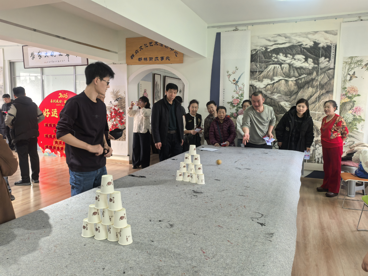趣味运动区同样人气高涨,“好运乒乓球”与“桌面保龄球”吸引了不少居民一试身手。在好运乒乓球区域,选手们手托球拍、稳步行进,既要控制速度,又要保持平衡,既考验专注力,也展现协调性。老人们沉稳而熟练,孩子们稚嫩却认真,围观居民不时为他们的精彩表现加油喝彩。桌面保龄球区则是一片欢声笑语,大家瞄准目标、果断出手,伴随着小球的滚动与纸杯的应声倒下,成功与遗憾交织成趣。邻里之间相互支招、彼此鼓励,陌生与隔阂悄然消融,取而代之的是浓浓的人情味与归属感。