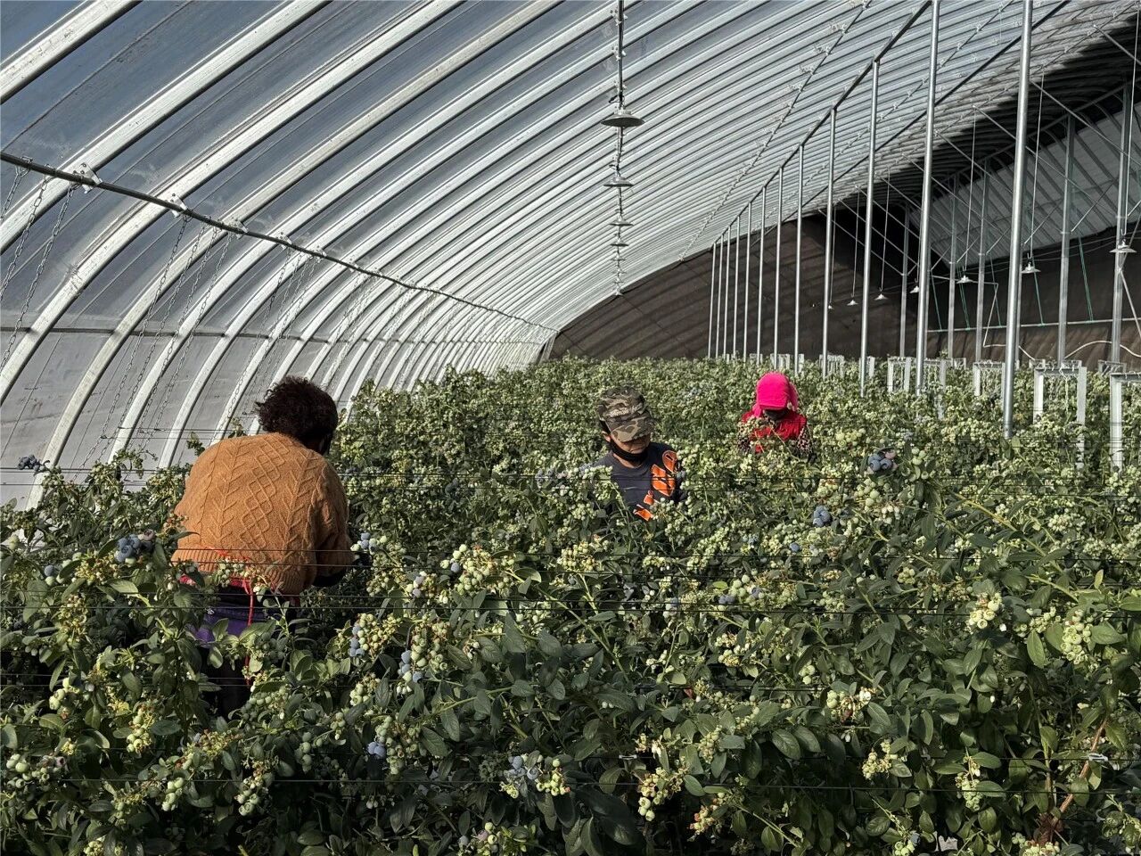 据了解,乌兰哈达镇蓝莓种植基地总规模140亩,共种植蓝莓2.1万棵,今年预计产量可达80吨以上。基地全部采用寒地填充式日光温室,配套智能温控、湿度实时监测等现代化设施,为蓝莓生长提供了良好环境,切实保障了果品品质优良。