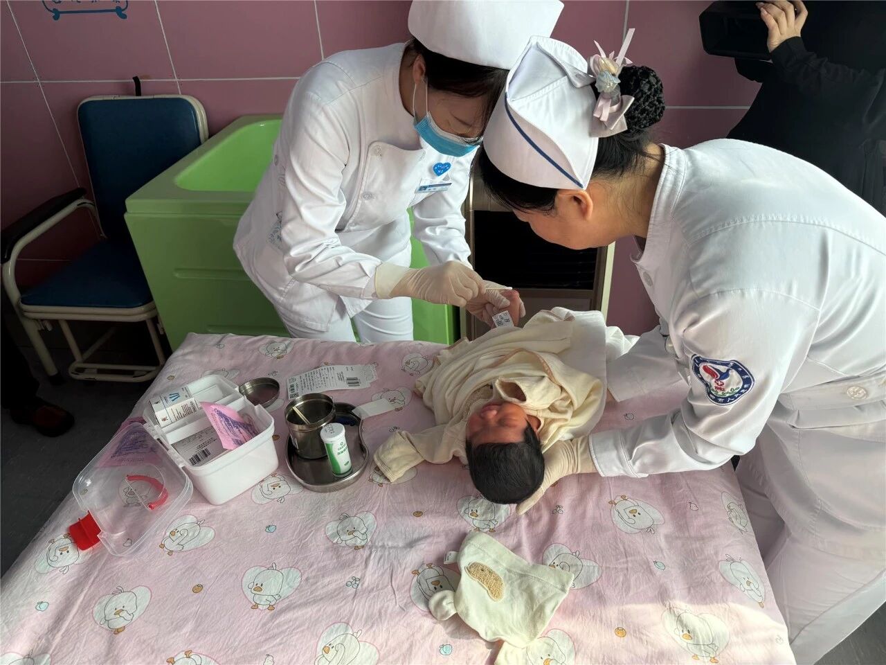 在乌兰浩特市人民医院预防接种室,医护人员正在对新生儿的足跟内侧进行消毒,随后使用一次性采血针刺破皮肤,轻轻挤压足跟,将流出的血液滴在新生儿血液采集卡上。待样本晾干后,再将其装入密封袋等待检测。